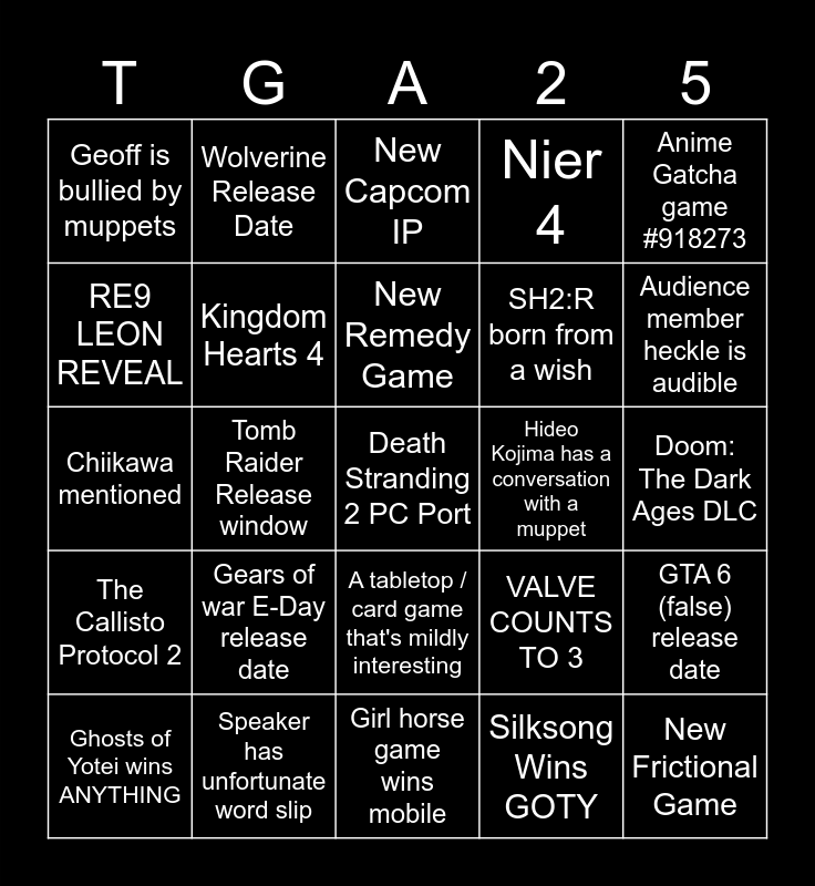 This bingo card has 25 words: Gears of war E-Day release date, Girl horse game wins mobile, New Remedy Game, Ghosts of Yotei wins ANYTHING, Anime Gatcha game #918273, Geoff is bullied by muppets, RE9 LEON REVEAL, Wolverine Release Date, Hideo Kojima has a conversation with a muppet, A tabletop / card game that's mildly interesting, SH2:R born from a wish, Chiikawa mentioned, VALVE COUNTS TO 3, GTA 6 (false) release date, Kingdom Hearts 4, New Frictional Game, Doom: The Dark Ages DLC, New Capcom IP, Audience member heckle is audible, Tomb Raider Release window, Death Stranding 2 PC Port, Speaker has unfortunate word slip, The Callisto Protocol 2, Nier 4 and Silksong Wins GOTY.