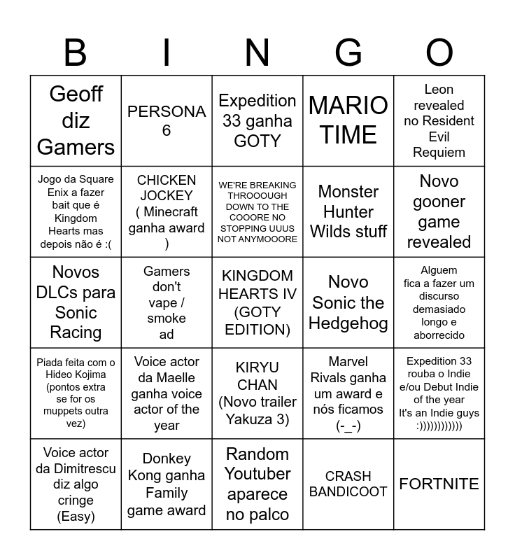 This bingo card has a free space and 24 words: Voice actor da Maelle ganha voice actor of the year, Donkey Kong ganha Family game award, WE'RE BREAKING THROOOUGH DOWN TO THE COOORE NO STOPPING UUUS NOT ANYMOOORE, Voice actor da Dimitrescu diz algo cringe (Easy), Leon revealed no Resident Evil Requiem, Geoff diz Gamers, Jogo da Square Enix a fazer bait que é Kingdom Hearts mas depois não é :(, PERSONA 6, Novo Sonic the Hedgehog, KIRYU CHAN (Novo trailer Yakuza 3), Monster Hunter Wilds stuff, Novos DLCs para Sonic Racing, Marvel Rivals ganha um award e nós ficamos (-_-), Expedition 33 rouba o Indie e/ou Debut Indie of the year It's an Indie guys :)))))))))))), CHICKEN JOCKEY ( Minecraft ganha award ), CRASH BANDICOOT, Alguem fica a fazer um discurso demasiado longo e aborrecido, Expedition 33 ganha GOTY, Novo gooner game revealed, Gamers don't vape / smoke ad, FORTNITE, Piada feita com o Hideo Kojima (pontos extra se for os muppets outra vez), MARIO TIME and Random Youtuber aparece no palco.