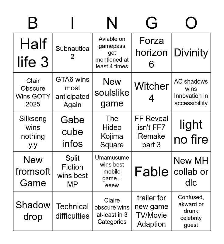 This bingo card has a free space and 24 words: Split Fiction wins best MP, Technical difficulties, New soulslike game, Shadow drop, Divinity, Half life 3, Clair Obscure Wins GOTY 2025, Subnautica 2, FF Reveal isn't FF7 Remake part 3, Umamusume wins best mobile game... eeew, Witcher 4, Silksong wins nothing y.y, Fable, New MH collab or dlc, GTA6 wins most anticipated Again, trailer for new game TV/Movie Adaption, light no fire, Aviable on gamepass get mentioned at least 4 times, AC shadows wins Innovation in accessibillity, Gabe cube infos, Confused, akward or drunk celebrity guest, New fromsoft Game, Forza horizon 6 and Claire obscure wins at-least in 3 Categories.
