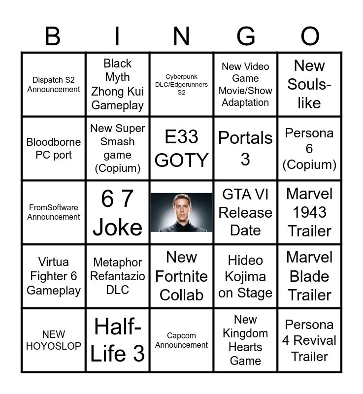 This bingo card has a free space and 24 words: Metaphor Refantazio DLC, Half-Life 3, E33 GOTY, NEW HOYOSLOP, New Souls-like, Dispatch S2 Announcement, Bloodborne PC port, Black Myth Zhong Kui Gameplay, GTA VI Release Date, New Fortnite Collab, Portals 3, FromSoftware Announcement, Hideo Kojima on Stage, Marvel Blade Trailer, New Super Smash game (Copium), New Kingdom Hearts Game, Marvel 1943 Trailer, Cyberpunk DLC/Edgerunners S2, Persona 6 (Copium), 6 7 Joke, Persona 4 Revival Trailer, Virtua Fighter 6 Gameplay, New Video Game Movie/Show Adaptation and Capcom Announcement.