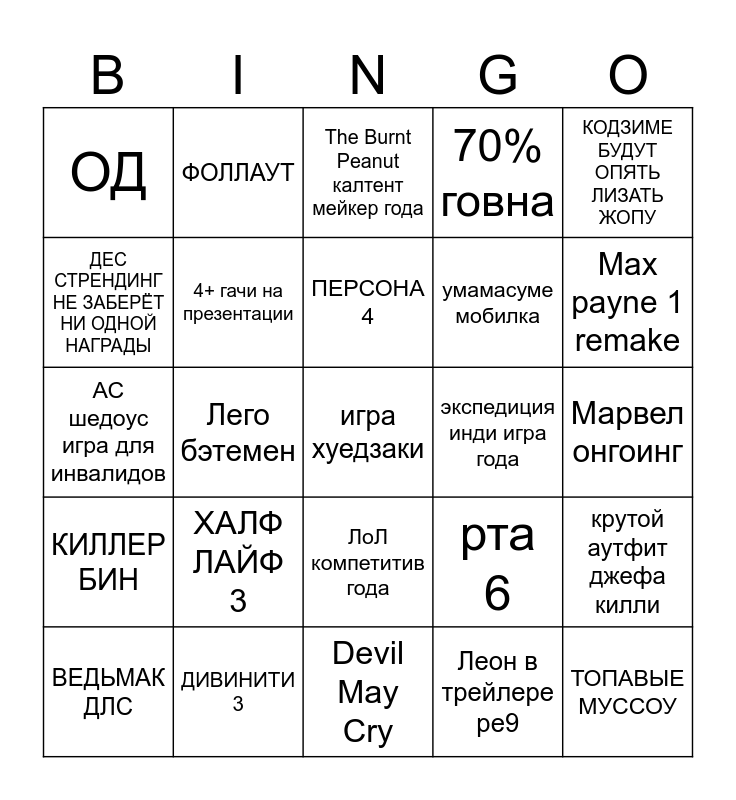 This bingo card has a free space and 24 words: ХАЛФ ЛАЙФ 3, ДИВИНИТИ 3, ПЕРСОНА 4, ВЕДЬМАК ДЛС, КОДЗИМЕ БУДУТ ОПЯТЬ ЛИЗАТЬ ЖОПУ, ОД, ДЕС СТРЕНДИНГ НЕ ЗАБЕРЁТ НИ ОДНОЙ НАГРАДЫ, ФОЛЛАУТ, экспедиция инди игра года, ЛоЛ компетитив года, умамасуме мобилка, АС шедоус игра для инвалидов, рта 6, крутой аутфит джефа килли, 4+ гачи на презентации, Леон в трейлере ре9, Марвел онгоинг, The Burnt Peanut калтент мейкер года, Max payne 1 remake, Лего бэтемен, ТОПАВЫЕ МУССОУ, КИЛЛЕР БИН, 70% говна and Devil May Cry.