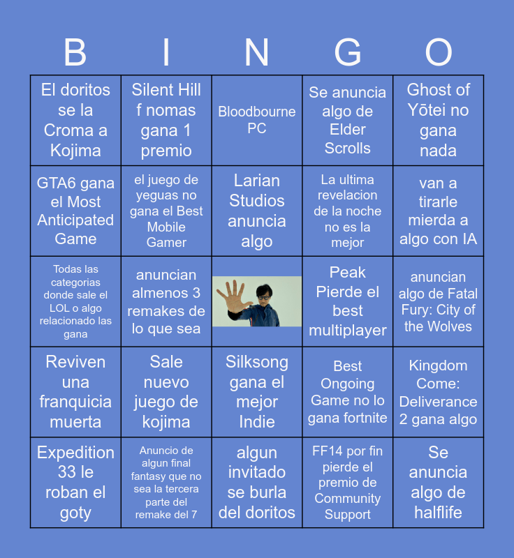 This bingo card has a free space and 24 words: Expedition 33 le roban el goty, Sale nuevo juego de kojima, Larian Studios anuncia algo, FF14 por fin pierde el premio de Community Support, Ghost of Yōtei no gana nada, El doritos se la Croma a Kojima, Silent Hill f nomas gana 1 premio, Bloodbourne PC, Peak Pierde el best multiplayer, anuncian algo de Fatal Fury: City of the Wolves, Todas las categorias donde sale el LOL o algo relacionado las gana, el juego de yeguas no gana el Best Mobile Gamer, Best Ongoing Game no lo gana fortnite, Kingdom Come: Deliverance 2 gana algo, GTA6 gana el Most Anticipated Game, Anuncio de algun final fantasy que no sea la tercera parte del remake del 7, algun invitado se burla del doritos, Se anuncia algo de Elder Scrolls, van a tirarle mierda a algo con IA, Reviven una franquicia muerta, anuncian almenos 3 remakes de lo que sea, Silksong gana el mejor Indie, La ultima revelacion de la noche no es la mejor and Se anuncia algo de halflife.