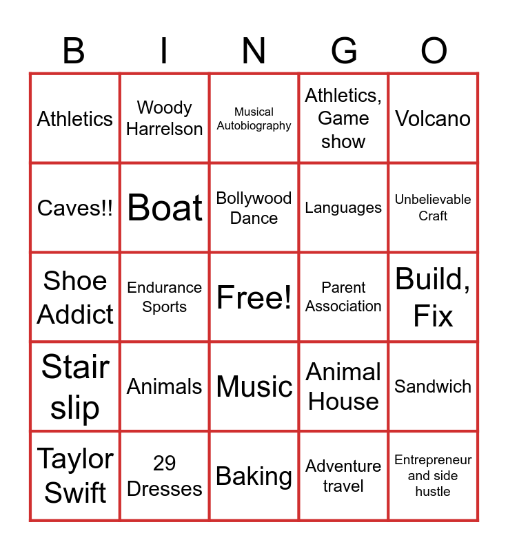 This bingo card has a free space and 26 words: Music, Adventure travel, Bollywood Dance, 29 Dresses, Volcano, Athletics, Caves!!, Woody Harrelson, Build, Fix, Animal House, Languages, Shoe Addict, Sandwich, Taylor Swift, Endurance Sports, Hoop, Athletics, Game show, Stair slip, Musical Autobiography, Entrepreneur and side hustle, Unbelievable Craft, Baking, Parent Association, Animals, Boat and Rockette.