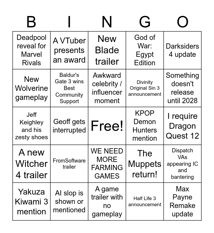 This bingo card has a free space and 58 words: GTA 6 gets mentioned at least twice, AI slop is shown or mentioned, Red Dead 3 teaser, A new Witcher 4 trailer, Half Life 3 announcement, Sleeping Dogs 2, Baldur's Gate 3 wins Best Community Support, PON gameplay footage, Divinity Original Sin 3 announcement, Tomb Raider remake, God of War: Egypt Edition, Fable mentioned or teased, Bloodborne 2, KOTOR announcement, Indie game focused on playing as an animal, Deadpool reveal for Marvel Rivals, Max Payne Remake update, Darksiders 4 update, The return of our beautiful Flute Guy, Awkward celebrity / influencer moment, KPOP Demon Hunters mention, New Blade trailer, Yakuza Kiwami 3 mention, Dispatch VAs appearing IC and bantering, Persona 4 Revival trailer, I require Dragon Quest 12, New Persona game announcement, Clair Obscura has its LOS awards moment, Something doesn't release until 2028, A game is shadow dropped, Kojima on stage once again, Dispatch wins its one award, Sports or racing game is announced, Steam Machine price reveal, New video game movie/show announced, Jet Set Radio reboot?, Next mainline Sonic game, Geoff gets interrupted, Jeff Keighley and his zesty shoes, Square Enix announces a remake game, FromSoftware trailer, WRAP IT UP!, The Muppets return!, Kingdom Hearts 4 update, Silk Song wins an award it deserves, DLC for Clair Obscura, Hoyoverse trailer, WE NEED MORE FARMING GAMES, A game trailer with no gameplay, Collab or crossover game event, Leon reveal in RE9, Licensed anime game that isn't Dragon Ball, PEAK wins best multiplayer, Revival of a dead franchise, A VTuber presents an award, Naughty Dog announcement that isn't Last of Us, New Wolverine gameplay and Ubisoft try to win us over with Black Flag.