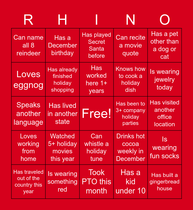 This bingo card has a free space and 24 words: Watched 5+ holiday movies this year, Is wearing something red, Has worked here 1+ years, Has traveled out of the country this year, Has a pet other than a dog or cat, Can name all 8 reindeer, Loves eggnog, Has a December birthday, Has been to 3+ company holiday parties, Can whistle a holiday tune, Knows how to cook a holiday dish, Speaks another language, Drinks hot cocoa weekly in December, Is wearing fun socks, Has already finished holiday shopping, Has a kid under 10, Has visited another office location, Has played Secret Santa before, Is wearing jewelry today, Has lived in another state, Has built a gingerbread house, Loves working from home, Can recite a movie quote and Took PTO this month.