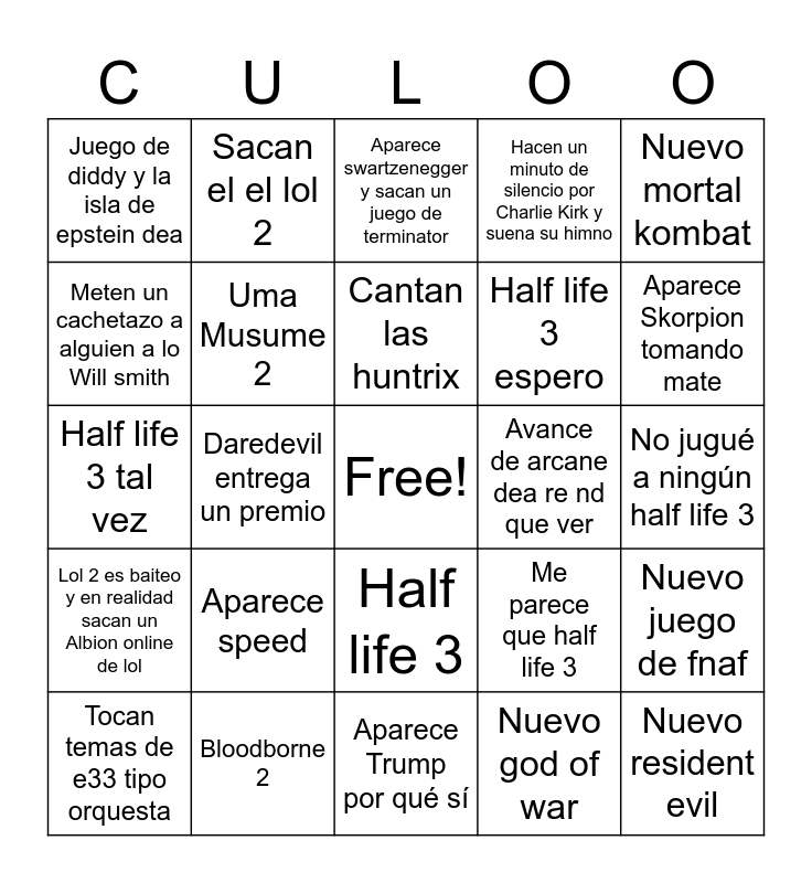 This bingo card has a free space and 24 words: Aparece speed, Bloodborne 2, Cantan las huntrix, Tocan temas de e33 tipo orquesta, Nuevo mortal kombat, Juego de diddy y la isla de epstein dea, Meten un cachetazo a alguien a lo Will smith, Sacan el el lol 2, Avance de arcane dea re nd que ver, Half life 3, Half life 3 espero, Half life 3 tal vez, Me parece que half life 3, Nuevo juego de fnaf, Uma Musume 2, Nuevo god of war, No jugué a ningún half life 3, Aparece swartzenegger y sacan un juego de terminator, Aparece Skorpion tomando mate, Daredevil entrega un premio, Nuevo resident evil, Lol 2 es baiteo y en realidad sacan un Albion online de lol, Hacen un minuto de silencio por Charlie Kirk y suena su himno and Aparece Trump por qué sí.