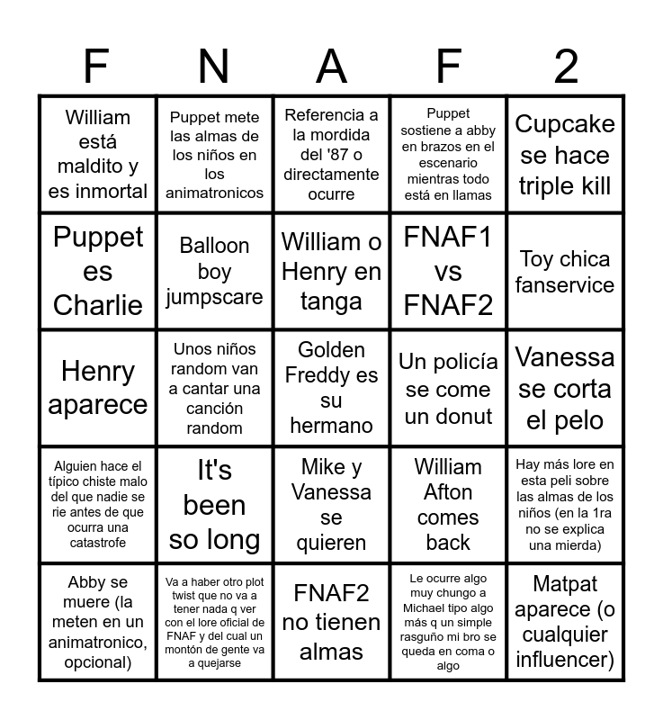 This bingo card has 25 words: It's been so long, FNAF2 no tienen almas, William o Henry en tanga, Abby se muere (la meten en un animatronico, opcional), Cupcake se hace triple kill, William está maldito y es inmortal, Puppet es Charlie, Puppet mete las almas de los niños en los animatronicos, Un policía se come un donut, Mike y Vanessa se quieren, FNAF1 vs FNAF2, Henry aparece, William Afton comes back, Hay más lore en esta peli sobre las almas de los niños (en la 1ra no se explica una mierda), Balloon boy jumpscare, Matpat aparece (o cualquier influencer), Vanessa se corta el pelo, Referencia a la mordida del '87 o directamente ocurre, Toy chica fanservice, Unos niños random van a cantar una canción random, Golden Freddy es su hermano, Va a haber otro plot twist que no va a tener nada q ver con el lore oficial de FNAF y del cual un montón de gente va a quejarse, Alguien hace el típico chiste malo del que nadie se rie antes de que ocurra una catastrofe, Puppet sostiene a abby en brazos en el escenario mientras todo está en llamas and Le ocurre algo muy chungo a Michael tipo algo más q un simple rasguño mi bro se queda en coma o algo.