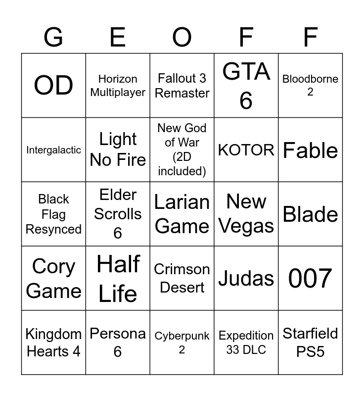 This bingo card has a free space and 24 words: Half Life, Persona 6, New God of War (2D included), Kingdom Hearts 4, Bloodborne 2, OD, Intergalactic, Horizon Multiplayer, New Vegas, Crimson Desert, KOTOR, Black Flag Resynced, Judas, 007, Light No Fire, Expedition 33 DLC, Blade, Fallout 3 Remaster, Fable, Elder Scrolls 6, Starfield PS5, Cory Game, GTA 6 and Cyberpunk 2.