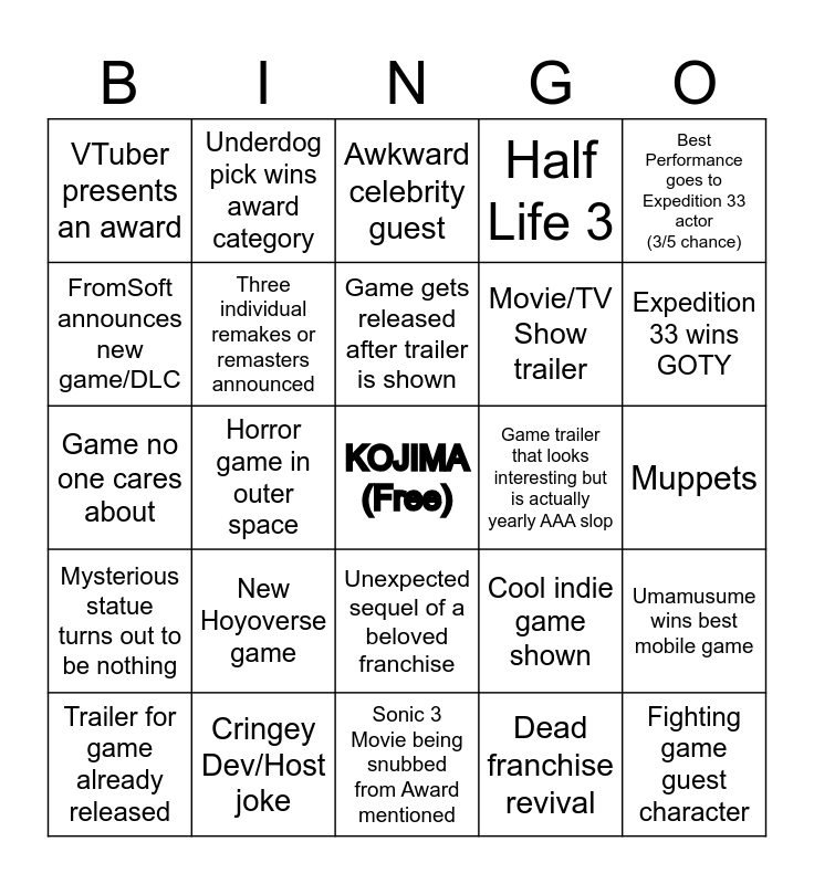 This bingo card has a free space and 24 words: New Hoyoverse game, Cringey Dev/Host joke, Game gets released after trailer is shown, Trailer for game already released, Best Performance goes to Expedition 33 actor (3/5 chance), VTuber presents an award, FromSoft announces new game/DLC, Underdog pick wins award category, Game trailer that looks interesting but is actually yearly AAA slop, Unexpected sequel of a beloved franchise, Movie/TV Show trailer, Game no one cares about, Cool indie game shown, Umamusume wins best mobile game, Three individual remakes or remasters announced, Dead franchise revival, Muppets, Awkward celebrity guest, Expedition 33 wins GOTY, Horror game in outer space, Fighting game guest character, Mysterious statue turns out to be nothing, Half Life 3 and Sonic 3 Movie being snubbed from Award mentioned.