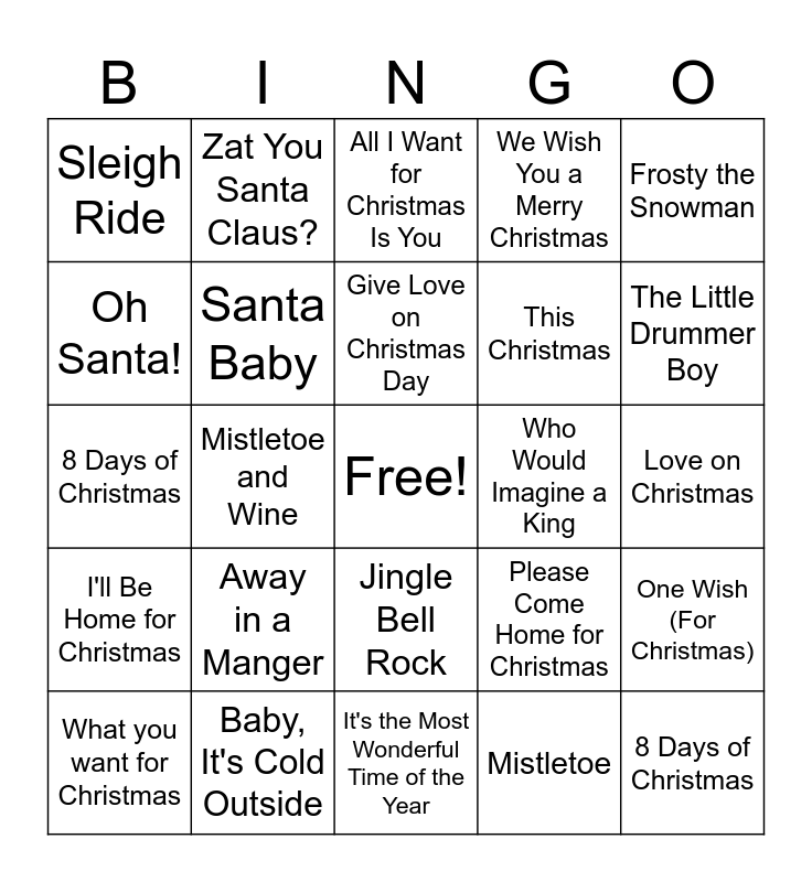 This bingo card has a free space and 101 words: Santa Claus Is Comin' to Town, Rudolph the Red-Nosed Reindeer, Frosty the Snowman, Here Comes Santa Claus, I Saw Mommy Kissing Santa Claus, The Chipmunk Song (Christmas Don't Be Late), The Twelve Days of Christmas, Jingle Bells, Wonderful Christmastime, Christmas (Baby Please Come Home), Happy Xmas (War Is Over), Do You Hear What I Hear?, Feliz Navidad, Please Come Home for Christmas, What Christmas Means to Me, Last Christmas, I'll Be Home for Christmas, The Christmas Waltz, Silent Night, O Holy Night, Joy to the World, The First Noël, Hark! The Herald Angels Sing, Deck the Halls, O Come All Ye Faithful, The Little Drummer Boy, We Wish You a Merry Christmas, Away in a Manger, Underneath the Tree, Merry Christmas, Happy Holidays, Zat You Santa Claus?, All I Want for Christmas Is You, Last Christmas, Rockin' Around the Christmas Tree, Underneath the Tree, Jingle Bell Rock, Santa Tell Me, The Christmas Song, Mistletoe, It's the Most Wonderful Time of the Year, Merry Christmas, Happy Holidays, What you want for Christmas, Blue Christmas, Like It's Christmas, White Christmas, 8 Days of Christmas, A Holly Jolly Christmas (Burl Ives), Let It Snow! Let It Snow! Let It Snow! (Dean Martin), Merry Christmas (Ed Sheeran & Elton John), Have Yourself a Merry Little Christmas (Judy Garland/Frank Sinatra), Santa Claus Is Comin' to Town, Oh Santa!, Sleigh Ride, You Make It Feel Like Christmas, Feliz Navidad (José Feliciano), Winter Wonderland (Darlene Love/Eurythmics), Rudolph the Red-Nosed Reindeer, Run Rudolph Run, It's Beginning to Look a Lot Like Christmas, Driving Home for Christmas, Santa Baby, Happy Xmas (War Is Over), Wonderful Christmastime, Step Into Christmas, I Saw Mommy Kissing Santa Claus, This Christmas, (There's No Place Like) Home for the Holidays, Mistletoe and Wine, Baby, It's Cold Outside, Silver Bells, The Chipmunk Song (Christmas Don't Be Late) (The Chipmunks), Frosty the Snowman, Sleigh Ride, No happy holidays, Give Love on Christmas Day, 8 Days of Christmas, Let it snow, O Holy Night, Have Yourself a Merry Little Christmas, Christmas Time Is Here, What Christmas Means to Me, Someday at Christmas, Who Would Imagine a King, Every Year, Every Christmas, It’s Christmas Time Again, Santa Baby, Love on Christmas, Happy Holidays to You, White Christmas, All I Want for Christmas Is You, Please Come Home for Christmas, The Christmas Song, Grown-Up Christmas List, What Do the Lonely Do at Christmas, My Favorite Things, One Wish (For Christmas), Merry Christmas Baby, It’s Christmas All Over the World, I Saw Mommy Kissing Santa Claus, Joy to the World and This Time of Year.