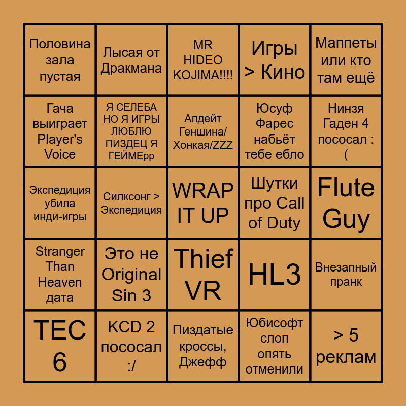 This bingo card has 25 words: Это не Original Sin 3, Пиздатые кроссы, Джефф, Апдейт Геншина/Хонкая/ZZZ, ТЕС 6, Маппеты или кто там ещё, Половина зала пустая, Гача выиграет Player's Voice, Лысая от Дракмана, Шутки про Call of Duty, Thief VR, Юсуф Фарес набьёт тебе ебло, Экспедиция убила инди-игры, HL3, Внезапный пранк, Я СЕЛЕБА НО Я ИГРЫ ЛЮБЛЮ ПИЗДЕЦ Я ГЕЙМЕрр, > 5 реклам, Flute Guy, MR HIDEO KOJIMA!!!!, Нинзя Гаден 4 пососал :(, Силксонг > Экспедиция, WRAP IT UP, KCD 2 пососал :/, Stranger Than Heaven дата, Игры > Кино and Юбисофт слоп опять отменили.