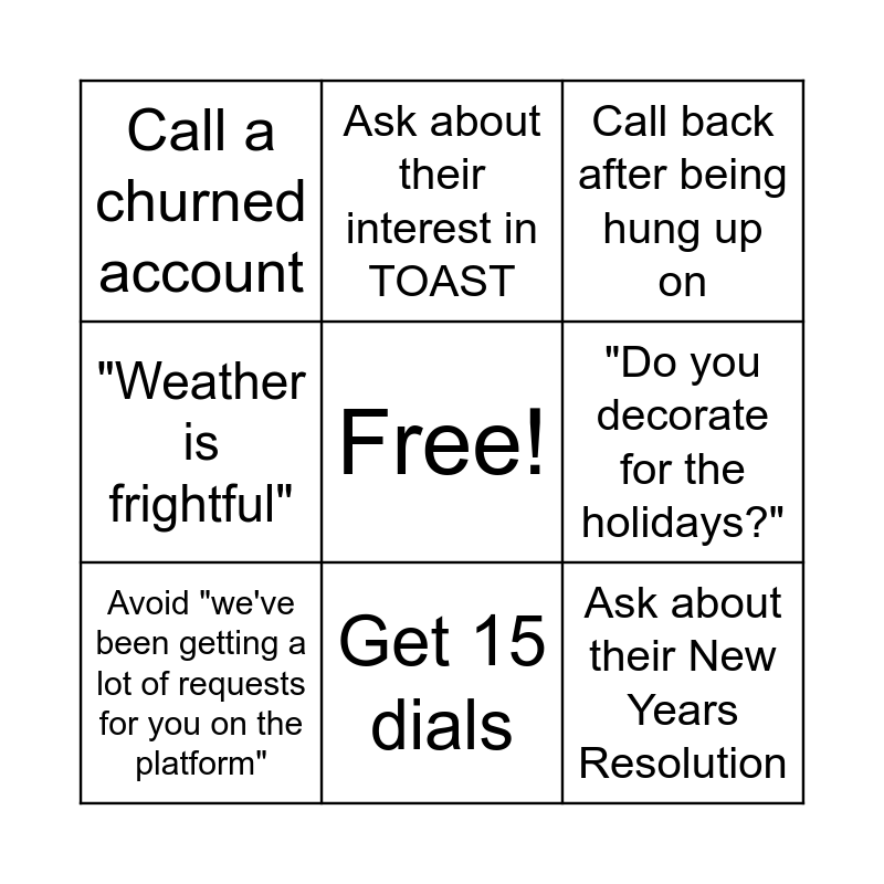 This bingo card has a free space and 8 words: "Do you decorate for the holidays?", Call back after being hung up on, Ask about their interest in TOAST, Avoid "we've been getting a lot of requests for you on the platform", Call a churned account, Ask about their New Years Resolution, "Weather is frightful" and Get 15 dials.