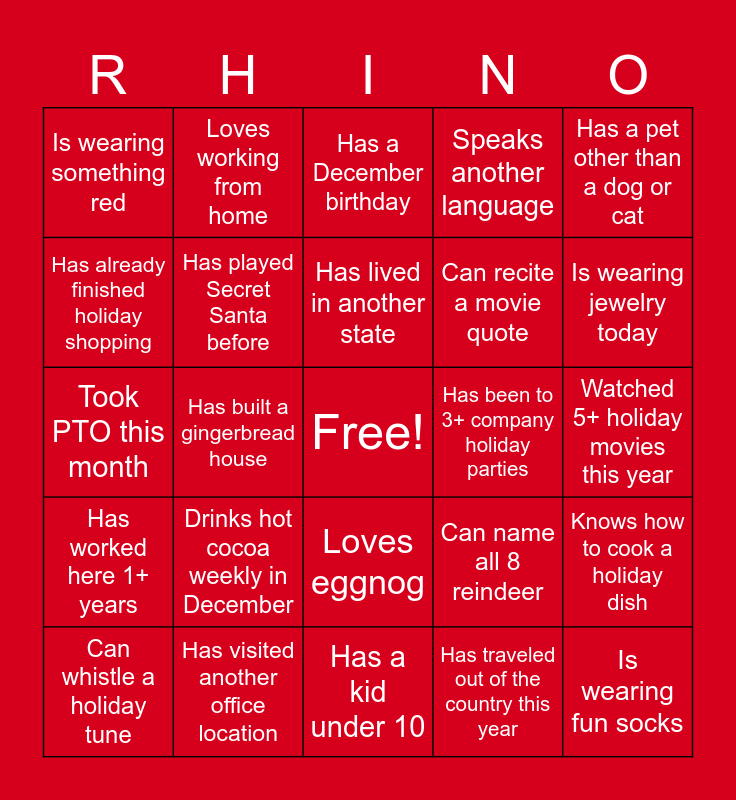 This bingo card has a free space and 24 words: Can whistle a holiday tune, Drinks hot cocoa weekly in December, Has lived in another state, Has traveled out of the country this year, Has a pet other than a dog or cat, Is wearing something red, Loves working from home, Has a December birthday, Has been to 3+ company holiday parties, Watched 5+ holiday movies this year, Took PTO this month, Has played Secret Santa before, Can name all 8 reindeer, Knows how to cook a holiday dish, Has already finished holiday shopping, Has visited another office location, Has a kid under 10, Speaks another language, Is wearing jewelry today, Has worked here 1+ years, Has built a gingerbread house, Loves eggnog, Can recite a movie quote and Is wearing fun socks.