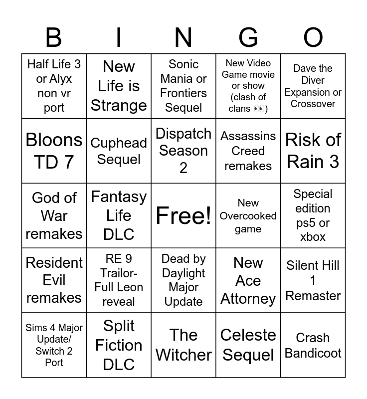 This bingo card has a free space and 24 words: RE 9 Trailor- Full Leon reveal, Split Fiction DLC, Dispatch Season 2, Sims 4 Major Update/ Switch 2 Port, Dave the Diver Expansion or Crossover, Half Life 3 or Alyx non vr port, Bloons TD 7, New Life is Strange, New Overcooked game, Dead by Daylight Major Update, Assassins Creed remakes, God of War remakes, New Ace Attorney, Silent Hill 1 Remaster, Cuphead Sequel, Celeste Sequel, Special edition ps5 or xbox, Sonic Mania or Frontiers Sequel, Risk of Rain 3, Fantasy Life DLC, Crash Bandicoot, Resident Evil remakes, New Video Game movie or show (clash of clans 👀) and The Witcher.