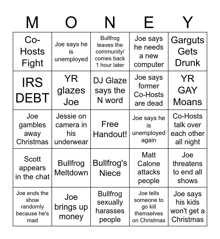 This bingo card has a free space and 24 words: Bullfrog Meltdown, Joe brings up money, DJ Glaze says the N word, Joe ends the show randomly because he's mad, Garguts Gets Drunk, Co-Hosts Fight, IRS DEBT, Joe says he is unemployed, Joe says he is unemployed again, Bullfrog's Niece, Joe says former Co-Hosts are dead, Joe gambles away Christmas, Matt Calone attacks people, Joe threatens to end all shows, YR glazes Joe, Joe tells someone to go kill themselves on Christmas, Co-Hosts talk over each other all night, Bullfrog leaves the community/ comes back 1 hour later, YR GAY Moans, Jessie on camera in his underwear, Joe says his kids won't get a Christmas, Scott appears in the chat, Joe says he needs a new computer and Bullfrog sexually harasses people.