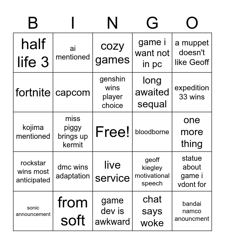 This bingo card has a free space and 24 words: dmc wins adaptation, from soft, genshin wins player choice, sonic announcement, a muppet doesn't like Geoff, half life 3, fortnite, ai mentioned, bloodborne, live service, long awaited sequal, kojima mentioned, geoff kiegley motivational speech, statue about game i vdont for, capcom, chat says woke, one more thing, cozy games, expedition 33 wins, miss piggy brings up kermit, bandai namco anouncment, rockstar wins most anticipated, game i want not in pc and game dev is awkward.