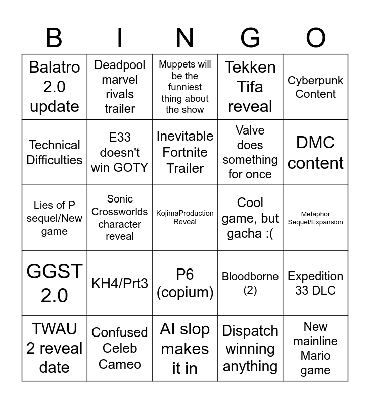 This bingo card has a free space and 24 words: KH4/Prt3, Confused Celeb Cameo, Inevitable Fortnite Trailer, TWAU 2 reveal date, Cyberpunk Content, Balatro 2.0 update, Technical Difficulties, Deadpool marvel rivals trailer, Cool game, but gacha :(, P6 (copium), Valve does something for once, Lies of P sequel/New game, Bloodborne (2), Expedition 33 DLC, E33 doesn't win GOTY, Dispatch winning anything, Metaphor Sequel/Expansion, Muppets will be the funniest thing about the show, DMC content, Sonic Crossworlds character reveal, New mainline Mario game, GGST 2.0, Tekken Tifa reveal and AI slop makes it in.