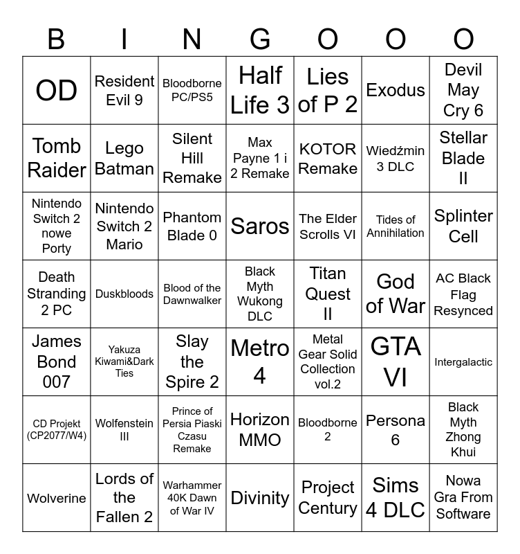 This bingo card has a free space and 48 words: Bloodborne 2, Wiedźmin 3 DLC, Divinity, Duskbloods, Phantom Blade 0, AC Black Flag Resynced, Resident Evil 9, Lords of the Fallen 2, Exodus, Metro 4, Devil May Cry 6, Half Life 3, Tides of Annihilation, The Elder Scrolls VI, CD Projekt (CP2077/W4), God of War, Tomb Raider, Stellar Blade II, Persona 6, Lies of P 2, KOTOR Remake, Blood of the Dawnwalker, OD, Lego Batman, Black Myth Zhong Khui, Silent Hill Remake, Splinter Cell, Wolverine, Saros, Nintendo Switch 2 Mario, Sims 4 DLC, Titan Quest II, Intergalactic, Wolfenstein III, Death Stranding 2 PC, Metal Gear Solid Collection vol.2, GTA VI, Nintendo Switch 2 nowe Porty, Slay the Spire 2, Prince of Persia Piaski Czasu Remake, James Bond 007, Nowa Gra From Software, Bloodborne PC/PS5, Warhammer 40K Dawn of War IV, Max Payne 1 i 2 Remake, Horizon MMO, Yakuza Kiwami&Dark Ties and Project Century.