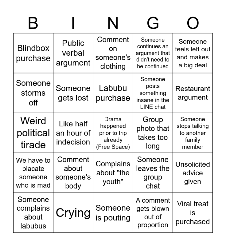 This bingo card has a free space and 24 words: Comment about someone's body, Crying, Labubu purchase, Someone complains about labubus, Someone feels left out and makes a big deal, Blindbox purchase, Someone storms off, Public verbal argument, Group photo that takes too long, Complains about "the youth", Someone posts something insane in the LINE chat, Weird political tirade, Someone leaves the group chat, Unsolicited advice given, Someone gets lost, A comment gets blown out of proportion, Someone stops talking to another family member, Comment on someone's clothing, Restaurant argument, Like half an hour of indecision, Viral treat is purchased, We have to placate someone who is mad, Someone continues an argument that didn't need to be continued and Someone is pouting.