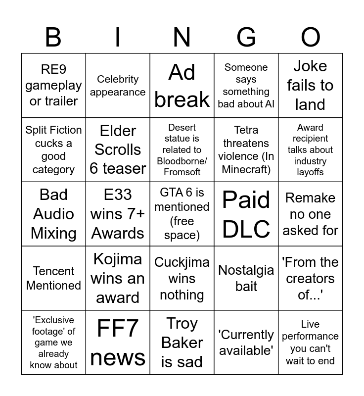 This bingo card has a free space and 24 words: Kojima wins an award, FF7 news, Desert statue is related to Bloodborne/ Fromsoft, 'Exclusive footage' of game we already know about, Joke fails to land, RE9 gameplay or trailer, Split Fiction cucks a good category, Celebrity appearance, Paid DLC, Cuckjima wins nothing, Tetra threatens violence (In Minecraft), Bad Audio Mixing, Nostalgia bait, 'From the creators of...', Elder Scrolls 6 teaser, 'Currently available', Remake no one asked for, Ad break, Award recipient talks about industry layoffs, E33 wins 7+ Awards, Live performance you can't wait to end, Tencent Mentioned, Someone says something bad about AI and Troy Baker is sad.