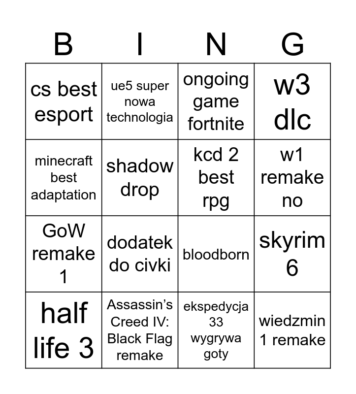 This bingo card has 17 words: ekspedycja 33 wygrywa goty, half life 3, ongoing game fortnite, cs best esport, dodatek do civki, w3 dlc, skyrim 6, kcd 2 best rpg, w1 remake no, shadow drop, Assassin’s Creed IV: Black Flag remake, bloodborn, minecraft best adaptation, ue5 super nowa technologia, GoW remake 1, helldivers 2 cos and wiedzmin 1 remake.