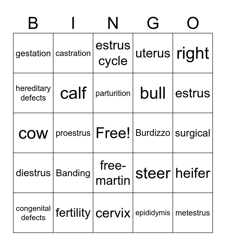 This bingo card has a free space and 24 words: Banding, fertility, parturition, congenital defects, right, gestation, hereditary defects, castration, Burdizzo, free-martin, bull, cow, steer, heifer, calf, epididymis, surgical, estrus cycle, estrus, proestrus, metestrus, diestrus, uterus and cervix.