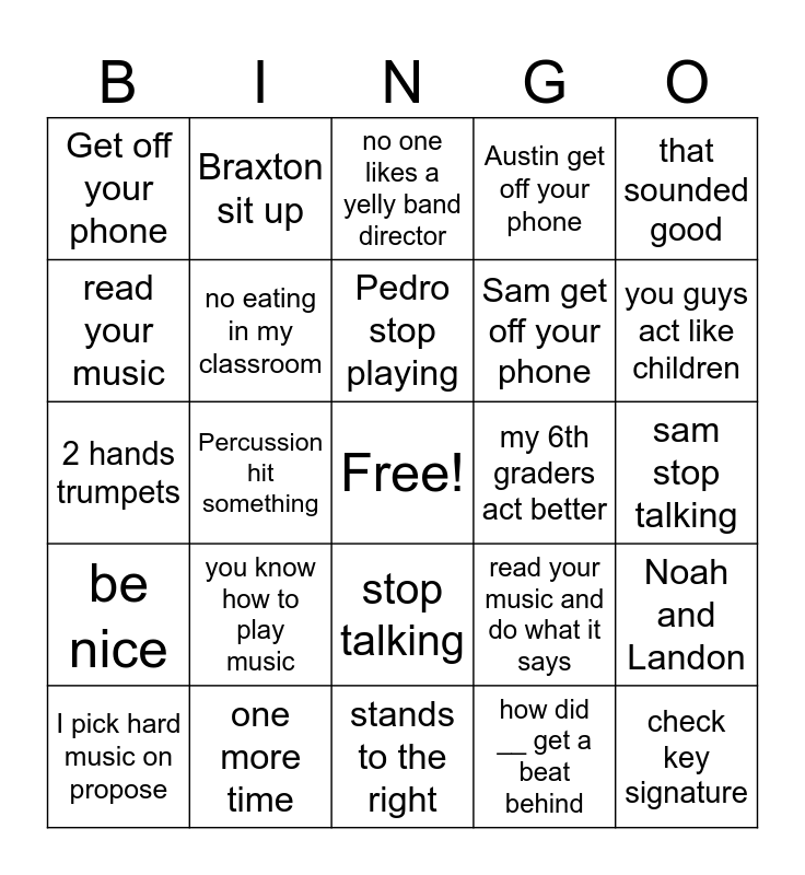 This bingo card has a free space and 30 words: one more time, wake up braxton, Percussion hit something, percussion to be on a part, Get off your phone, no one likes a yelly band director, no eating in my classroom, stop talking, my 6th graders act better, stands to the right, sam stop talking, check key signature, how did __ get a beat behind, Fix your posture, you guys act like children, if you play it you'll like it, read your music and do what it says, be nice, you know how to play music, that sounded good, 2 hands trumpets, headphones out your ears, Braxton sit up, Sam get off your phone, read your music, Austin get off your phone, Noah and Landon, I pick hard music on propose, Pedro stop playing and stay on tempo.