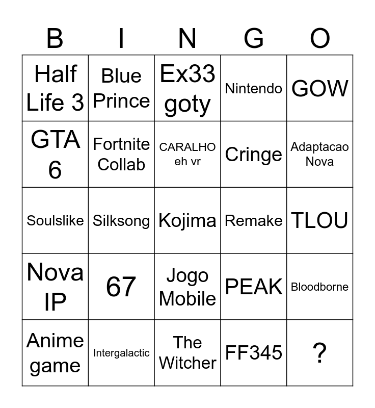 This bingo card has a free space and 24 words: 67, Intergalactic, CARALHO eh vr, Anime game, GOW, Half Life 3, GTA 6, Blue Prince, Remake, Jogo Mobile, Cringe, Soulslike, PEAK, Bloodborne, Fortnite Collab, FF345, TLOU, Ex33 goty, Adaptacao Nova, Silksong, ?, Nova IP, Nintendo and The Witcher.