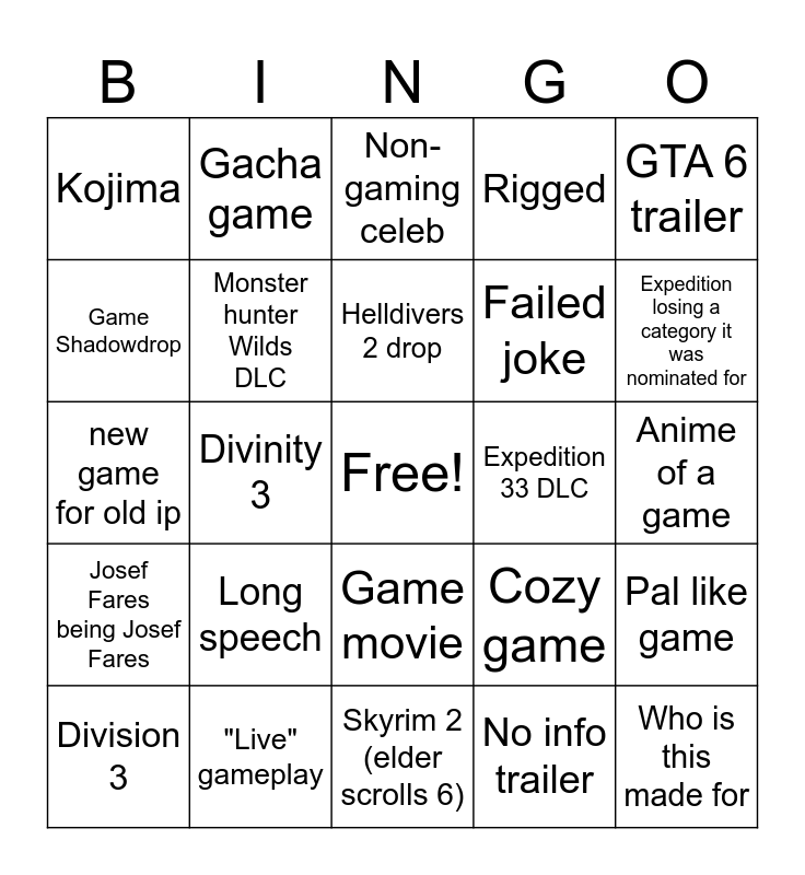This bingo card has a free space and 24 words: Long speech, "Live" gameplay, Helldivers 2 drop, Division 3, GTA 6 trailer, Kojima, Game Shadowdrop, Gacha game, Expedition 33 DLC, Game movie, Failed joke, new game for old ip, Cozy game, Pal like game, Monster hunter Wilds DLC, No info trailer, Anime of a game, Non-gaming celeb, Expedition losing a category it was nominated for, Divinity 3, Who is this made for, Josef Fares being Josef Fares, Rigged and Skyrim 2 (elder scrolls 6).