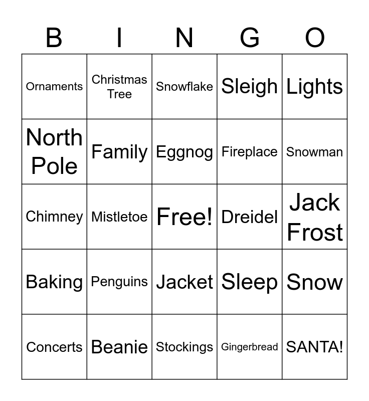 This bingo card has a free space and 50 words: HoHoHO, SANTA!, Elves, Stockings, Penguins, Grinch, Christmas Tree, Wreath, North Pole, Rudolph, Family, Sleigh, Snow, Sleep, Jingle Bells, Hanukkah, Eggnog, Dreidel, Candy canes, Lights, Mistletoe, Gingerbread, Ornaments, Fireplace, Gloves, Midterms, Snowman, Krampus, Snowflake, Jacket, Hot cocoa, Marshmallows, Polar bear, Scarf, Beanie, Cookies, Pine, Yule log, Scrooge, Jack Frost, Tinsel, Holly, Nutcracker, Bells, Concerts, Chimney, Wrapping paper, Caroling, Baking and Latkes.