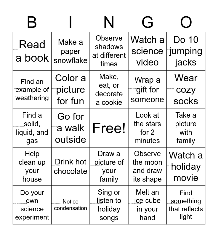 This bingo card has 16 images, a free space and 24 words: Drink hot chocolate, Notice condensation, Make, eat, or decorate a cookie, Do your own science experiment, Do 10 jumping jacks, Read a book, Find an example of weathering, Make a paper snowflake, Look at the stars for 2 minutes, Draw a picture of your family, Wrap a gift for someone, Find a solid, liquid, and gas, Observe the moon and draw its shape, Watch a holiday movie, Color a picture for fun, Melt an ice cube in your hand, Take a picture with family, Observe shadows at different times, Wear cozy socks, Go for a walk outside, Find something that reflects light, Help clean up your house, Watch a science video and Sing or listen to holiday songs.