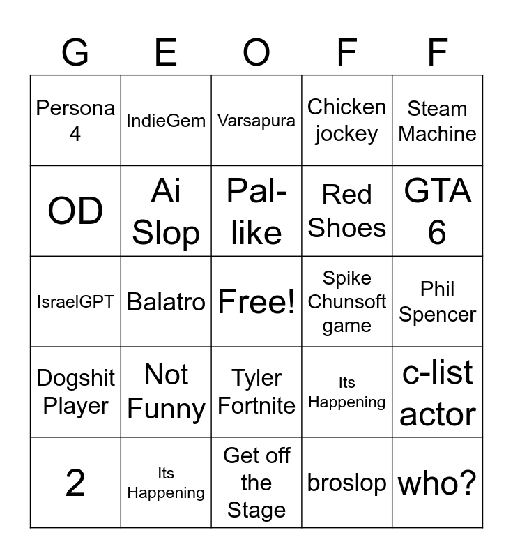 This bingo card has a free space and 24 words: Not Funny, Its Happening, Pal-like, 2, Steam Machine, Persona 4, OD, IndieGem, Spike Chunsoft game, Tyler Fortnite, Red Shoes, IsraelGPT, Its Happening, c-list actor, Ai Slop, broslop, Phil Spencer, Varsapura, GTA 6, Balatro, who?, Dogshit Player, Chicken jockey and Get off the Stage.