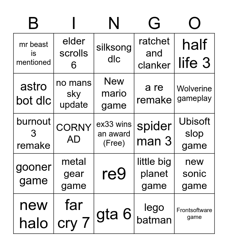 This bingo card has a free space and 24 words: metal gear game, far cry 7, New mario game, new halo, half life 3, mr beast is mentioned, astro bot dlc, elder scrolls 6, spider man 3, re9, a re remake, burnout 3 remake, little big planet game, new sonic game, no mans sky update, lego batman, Ubisoft slop game, silksong dlc, Wolverine gameplay, CORNY AD, Frontsoftware game, gooner game, ratchet and clanker and gta 6.