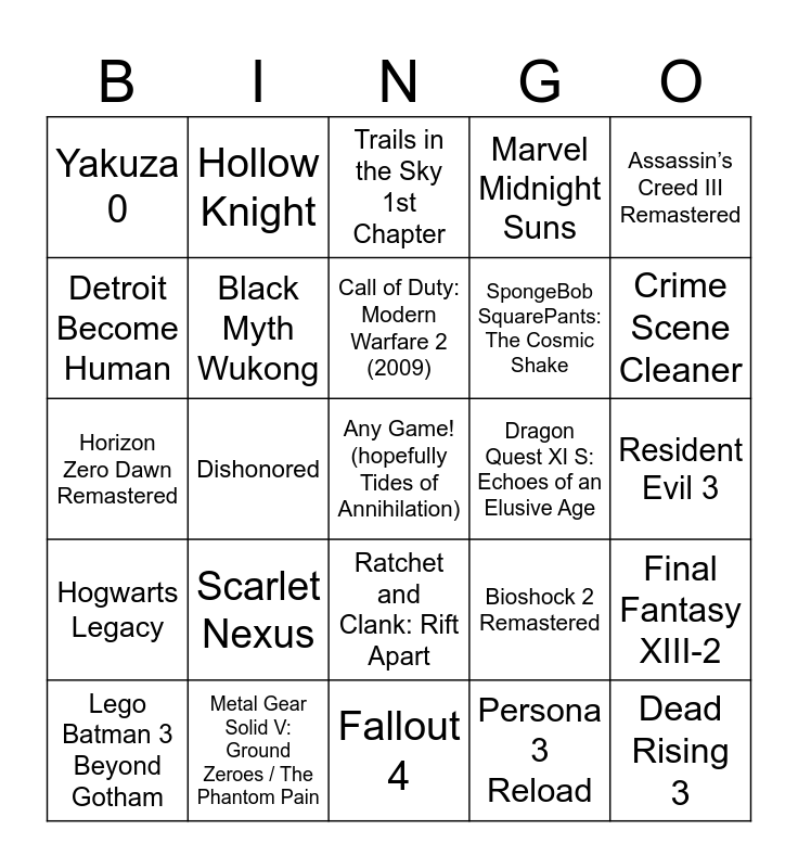 This bingo card has a free space and 24 words: Scarlet Nexus, Metal Gear Solid V: Ground Zeroes / The Phantom Pain, Call of Duty: Modern Warfare 2 (2009), Lego Batman 3 Beyond Gotham, Assassin’s Creed III Remastered, Yakuza 0, Detroit Become Human, Hollow Knight, Dragon Quest XI S: Echoes of an Elusive Age, Ratchet and Clank: Rift Apart, SpongeBob SquarePants: The Cosmic Shake, Horizon Zero Dawn Remastered, Bioshock 2 Remastered, Final Fantasy XIII-2, Black Myth Wukong, Persona 3 Reload, Resident Evil 3, Trails in the Sky 1st Chapter, Crime Scene Cleaner, Dishonored, Dead Rising 3, Hogwarts Legacy, Marvel Midnight Suns and Fallout 4.