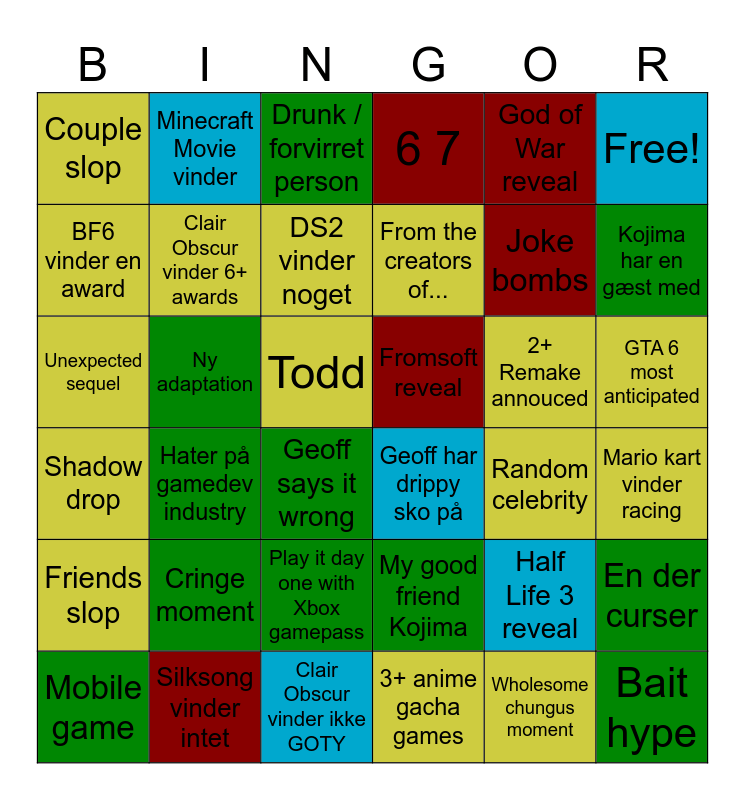 This bingo card has 36 images and 36 words: My good friend Kojima, Play it day one with Xbox gamepass, 3+ anime gacha games, BF6 vinder en award, Shadow drop, Fromsoft reveal, Clair Obscur vinder 6+ awards, Clair Obscur vinder ikke GOTY, God of War reveal, Half Life 3 reveal, Kojima har en gæst med, 6 7, En der curser, Ny adaptation, From the creators of..., Couple slop, Friends slop, 2+ Remake annouced, Unexpected sequel, Drunk / forvirret person, Todd, Hater på gamedev industry, Geoff har drippy sko på, Geoff says it wrong, Random celebrity, Minecraft Movie vinder, Joke bombs, Silksong vinder intet, DS2 vinder noget, Free!, Bait hype, Mobile game, Mario kart vinder racing, GTA 6 most anticipated, Cringe moment and Wholesome chungus moment.