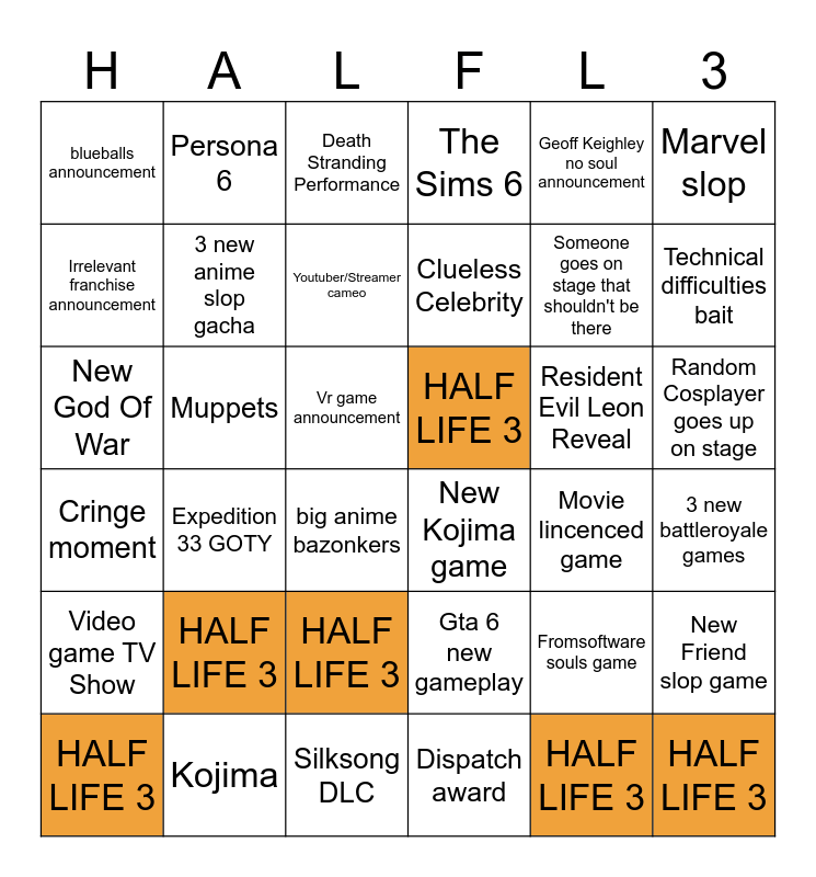 This bingo card has 36 words: Cringe moment, Expedition 33 GOTY, Silksong DLC, Clueless Celebrity, Resident Evil Leon Reveal, Random Cosplayer goes up on stage, blueballs announcement, Kojima, Death Stranding Performance, Gta 6 new gameplay, Someone goes on stage that shouldn't be there, Marvel slop, Video game TV Show, Muppets, Youtuber/Streamer cameo, The Sims 6, Fromsoftware souls game, 3 new battleroyale games, Irrelevant franchise announcement, 3 new anime slop gacha, big anime bazonkers, New Kojima game, Movie lincenced game, New Friend slop game, New God Of War, Persona 6, Vr game announcement, Dispatch award, Geoff Keighley no soul announcement, Technical difficulties bait, HALF LIFE 3, HALF LIFE 3, HALF LIFE 3, HALF LIFE 3, HALF LIFE 3 and HALF LIFE 3.