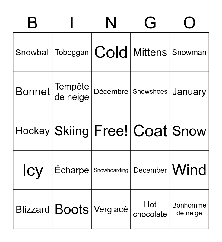 This bingo card has a free space and 70 words: Holidays, Snow, Snowflake, Shovel, Boots, Hat, Mittens, Scarf, Snowman, Icicle, Wind, Snowstorm, Snowball, Cold, Frost, Skiing, Snowboarding, Snowshoes, Ski hill, Icy, Coat, December, January, February, Winter solstice, Skating, Skates, Fireplace, Hot chocolate, Ice fishing, Toboggan, Sleigh, Snowpants, Winter, Vacances, Neige, Flocon de neige, Pelle, Bottes, Bonnet, Moufles, Écharpe, Bonhomme de neige, Glaçon, Vent, Tempête de neige, Blizzard, Boule de neige, Froid, Gel, Ski, Snowboard, Raquettes, Piste de ski, Verglacé, Manteau, Décembre, Janvier, Février, Solstice d'hiver, Hockey, Patinage, Patins, Curling, Cheminée, Chocolat chaud, Pêche sur glace, Traîneau, Pantalon de neige and Hiver.