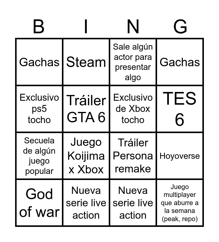 This bingo card has 20 words: Hoyoverse, Bethesda nuevo juego, Sale algún actor para presentar algo, Tes 6, God of war, Exclusivo ps5 tocho, Nueva serie live action, Gachas, Secuela de algún juego popular, Steam, Juego Koijima x Xbox, Tráiler Persona remake, Tráiler GTA 6, Juego multiplayer que aburre a la semana (peak, repo), Exclusivo de Xbox tocho, Juego con estilo anime, TES 6, Gachas, Nueva serie live action and Juego de Kojima con xbox.