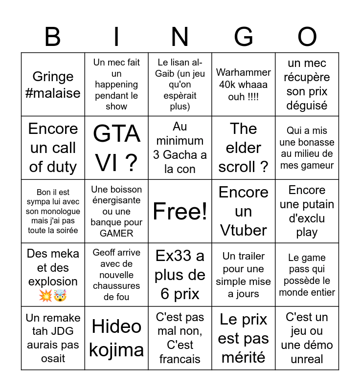 This bingo card has a free space and 24 words: Geoff arrive avec de nouvelle chaussures de fou, Hideo kojima, Au minimum 3 Gacha a la con, Un remake tah JDG aurais pas osait, un mec récupère son prix déguisé, Gringe #malaise, Encore un call of duty, Un mec fait un happening pendant le show, Encore un Vtuber, Ex33 a plus de 6 prix, The elder scroll ?, Bon il est sympa lui avec son monologue mais j'ai pas toute la soirée, Un trailer pour une simple mise a jours, Le game pass qui possède le monde entier, GTA VI ?, Le prix est pas mérité, Encore une putain d'exclu play, Le lisan al-Gaib (un jeu qu'on espèrait plus), Qui a mis une bonasse au milieu de mes gameur, Une boisson énergisante ou une banque pour GAMER, C'est un jeu ou une démo unreal, Des meka et des explosion 💥🤯, Warhammer 40k whaaa ouh !!!! and C'est pas mal non, C'est francais.