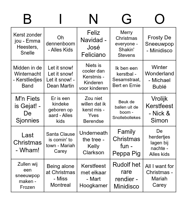 This bingo card has 34 words: All I want for Christmas - Mariah Carey, Rudolf het rare rendier - Minidisco, Jingle Bells - Christmas Party Stars, Jingle Bell Rock - Bobby Helms, Last Christmas - Wham!, Let it snow! Let it snow! Let it snow! - Dean Martin, Frosty De Sneeuwpop - Minidisco, Zullen wij een sneeuwpop maken - Frozen, Oh dennenboom - Alles Kids, Kling Klokjes Klingelingeling - Kerstliedjes Band, Niets is cooler dan Kerstmis - Kinderen voor kinderen, Feliz Navidad - José Feliciano, Why couldn't It Be Christmas - Bianca Ryan, Eenzaam - Bankzitters, Beuk de ballen uit de boom - Snollebollekes, Winter Wonderland - Michael Bublé, Being alone at Christmas - Miss Montreal, M'n Fiets is Gejat! - De Sjonnies, Santa Clause is comin' to town - Mariah Carey, Family Christmas fun - Peppa Pig, Underneath the tree - Kelly Clarkson, Santa tell me - Ariana Grande, Kerst zonder jou - Emma Heesters, Snelle, Vrolijk Kerstfeest - Nick & Simon, Kerstfeest met elkaar - Mart Hoogkamer, Zou niet willen dat ik kerst mis - Yves Berendse, Merry Christmas everyone - Shakin' Stevens, Sleigh Ride - The Ronettes, Ik ben een kerstbal - Sesamstraat, Bert en Ernie, Midden in de Winternacht - Kerstliedjes Band, Kerst in Smurfenland - De Smurfen, Er is een kindeke geboren op aard - Alles kids, De herdertjes lagen bij nachte - Alles kids and Stille nacht - Kerstliedjes band.