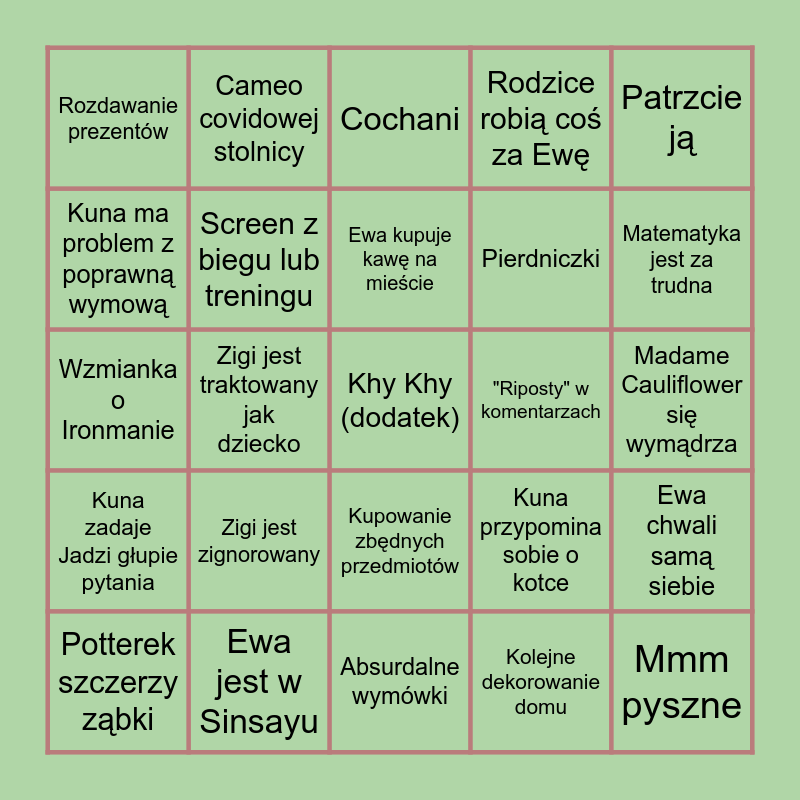 This bingo card has a free space and 24 words: Zigi jest zignorowany, Ewa jest w Sinsayu, Ewa kupuje kawę na mieście, Potterek szczerzy ząbki, Patrzcie ją, Rozdawanie prezentów, Kuna ma problem z poprawną wymową, Cameo covidowej stolnicy, "Riposty" w komentarzach, Kupowanie zbędnych przedmiotów, Pierdniczki, Wzmianka o Ironmanie, Kuna przypomina sobie o kotce, Ewa chwali samą siebie, Screen z biegu lub treningu, Kolejne dekorowanie domu, Madame Cauliflower się wymądrza, Cochani, Matematyka jest za trudna, Zigi jest traktowany jak dziecko, Mmm pyszne, Kuna zadaje Jadzi głupie pytania, Rodzice robią coś za Ewę and Absurdalne wymówki.