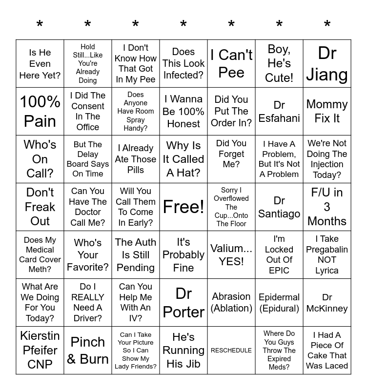 This bingo card has a free space and 48 words: Abrasion (Ablation), Dr Esfahani, He's Running His Jib, Can You Have The Doctor Call Me?, I Already Ate Those Pills, F/U in 3 Months, Hold Still...Like You're Already Doing, Pinch & Burn, Boy, He's Cute!, It's Probably Fine, Dr Jiang, Does This Look Infected?, I Have A Problem, But It's Not A Problem, Did You Forget Me?, What Are We Doing For You Today?, Dr Santiago, 100% Pain, Mommy Fix It, Epidermal (Epidural), I Can't Pee, Did You Put The Order In?, Will You Call Them To Come In Early?, Is He Even Here Yet?, I Did The Consent In The Office, Dr McKinney, Does Anyone Have Room Spray Handy?, We're Not Doing The Injection Today?, Kierstin Pfeifer CNP, Why Is It Called A Hat?, But The Delay Board Says On Time, Where Do You Guys Throw The Expired Meds?, Sorry I Overflowed The Cup...Onto The Floor, I Take Pregabalin NOT Lyrica, Do I REALLY Need A Driver?, Don't Freak Out, Valium... YES!, I'm Locked Out Of EPIC, Who's On Call?, The Auth Is Still Pending, Can You Help Me With An IV?, Does My Medical Card Cover Meth?, I Had A Piece Of Cake That Was Laced, I Don't Know How That Got In My Pee, Can I Take Your Picture So I Can Show My Lady Friends?, I Wanna Be 100% Honest, Dr Porter, Who's Your Favorite? and RESCHEDULE.