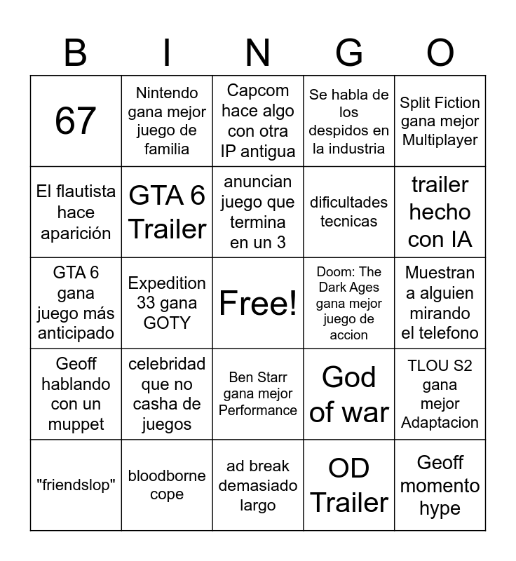 This bingo card has a free space and 24 words: celebridad que no casha de juegos, bloodborne cope, anuncian juego que termina en un 3, "friendslop", Split Fiction gana mejor Multiplayer, 67, El flautista hace aparición, Nintendo gana mejor juego de familia, Doom: The Dark Ages gana mejor juego de accion, Ben Starr gana mejor Performance, dificultades tecnicas, GTA 6 gana juego más anticipado, God of war, TLOU S2 gana mejor Adaptacion, GTA 6 Trailer, OD Trailer, Muestran a alguien mirando el telefono, Capcom hace algo con otra IP antigua, trailer hecho con IA, Expedition 33 gana GOTY, Geoff momento hype, Geoff hablando con un muppet, Se habla de los despidos en la industria and ad break demasiado largo.