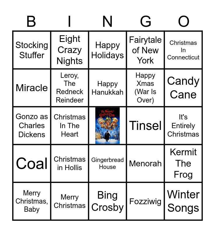 This bingo card has a free space and 39 words: The Night Santa Went Crazy, Stress, Mistletoe, Leroy, The Redneck Reindeer, Merry Christmas, Baby, Gingerbread House, Happy Hanukkah, Presents, Christmas In Connecticut, Coal, Christmas In The Heart, Fairytale of New York, Winter Songs, It's Entirely Christmas, Tinsel, Christmas in Hollis, Christmas in Prison, Stocking Stuffer, Gift Certificates, Menorah, Miracle, Bing Crosby, Happy Xmas (War Is Over), Candy Cane, Do They Know It's Christmas?, Scrooged, Tiny Tim, Brian Henson, December 25th, Eight Crazy Nights, Trick Out The Tree, DJ Play a Christmas Song, Happy Holidays, Merry Christmas, Fozziwig, Michael Caine, Kermit The Frog, Gonzo as Charles Dickens and Christmas at Ground Zero.