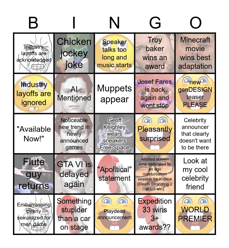 This bingo card has 20 images, a free space and 24 words: GTA VI is delayed again, Something stupider than a car on stage, Muppets appear, Embarrassing overly sexualized for men game, Minecraft movie wins best adaptation, Industry layoffs are acknowledged, Industry layoffs are ignored, Chicken jockey joke, Pleasantly surprised, "Apolitical" statement, Josef Fares is back again and wont stop, "Available Now!", Allotted screen time dedicated to an ego masturbation session for Kojima (Death Stranding 2 didn't win), Look at my cool celebrity friend, AI Mentioned, Expedition 33 wins 3+ awards??, Celebrity announcer that clearly doesn't want to be there, Speaker talks too long and music starts, new genDESIGN teaser PLEASE, Noticeable new trend in newly announced games, WORLD PREMIER, Flute guy returns, Troy baker wins an award and Playdead announcement.
