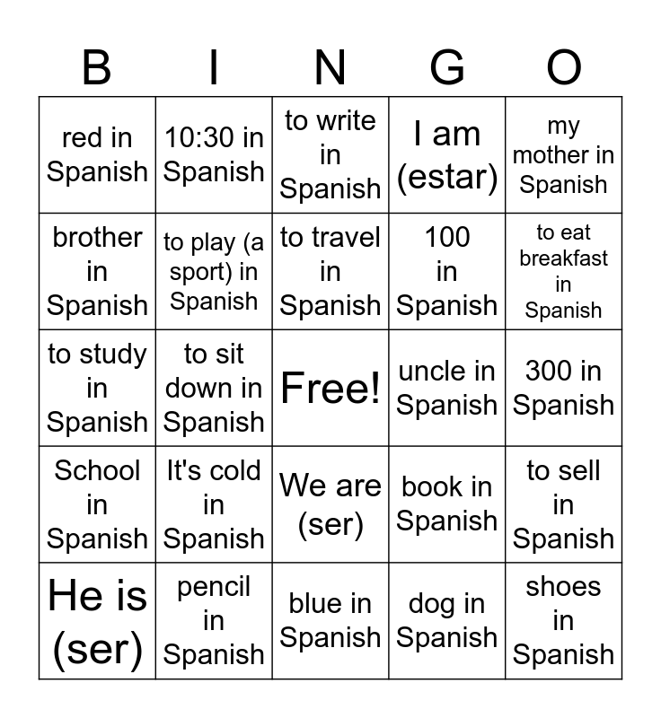 This bingo card has a free space and 54 words: I in Spanish, School in Spanish, You familiar in Spanish., Spanish class in Spanish, We are (ser), Happy in Spanish, I am (estar), birthday in Spanish, brother in Spanish, Hospital in Spanish, red in Spanish, Tired in Spanish, pencil in Spanish, He is (ser), They are (estar), blue in Spanish, shoes in Spanish, 100 in Spanish, My name is in Spanish, 300 in Spanish, book in Spanish, notebook in Spanish, uncle in Spanish, my mother in Spanish, 5:00 in Spanish, 10:30 in Spanish, black in Spanish, I have in Spanish, I know (a person) in Spanish, dog in Spanish, Where are you from? in Spanish, I live in the United States in Spanish, How old are you? in Spanish, to eat in Spanish, to write in Spanish, to read in Spanish, to study in Spanish, to sell in Spanish, to buy in Spanish, to play (a sport) in Spanish, 1:00 in Spanish, time in Spanish, What is the weather like? in Spanish, It's sunny in Spanish, It's cold in Spanish, coat in Spanish, we have in Spanish, to walk in Spanish, to travel in Spanish, to sit down in Spanish, to eat breakfast in Spanish, green in Spanish, snow/to snow in Spanish and rain/to rain in Spanish.