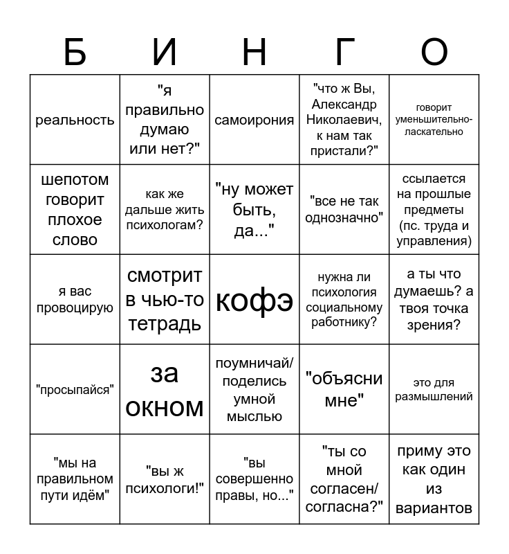 This bingo card has a free space and 43 words: упоминает слова "знак", "язык", приму это как один из вариантов, архетипы коллективного бессознательного, "мы на правильном пути идём", "здесь собрана элита группы", "ты со мной согласен/согласна?", самоирония, "запишем буквально пару предложений", говорит уменьшительно-ласкательно, "вы ж психологи!", "что ж Вы, Александр Николаевич, к нам так пристали?", нужна ли психология социальному работнику?, поумничай/поделись умной мыслью, за окном, "ставим запятую/многоточие", "вы совершенно правы, но...", это не я придумал/это не мои мысли, я вас провоцирую, "этот предмет новый в учебном плане", ссылается на прошлые предметы (пс. труда и управления), "я правильно думаю или нет?", длинная пауза, уверяет, что что-то будет востребованно в будущем, реальность, радуется десерту, а ты что думаешь? а твоя точка зрения?, Маечка, не ставим точку, "объясни мне", "просыпайся", подзаголовочек, это для размышлений, попробуем перечислить, смотрит в чью-то тетрадь, глубинный смысл, говорит "правда", когда кто-то чихает, отчитывает за опоздание, "ну может быть, да...", шепотом говорит плохое слово, "все не так однозначно", защищает советский союз, как же дальше жить психологам? and между нами девочками.