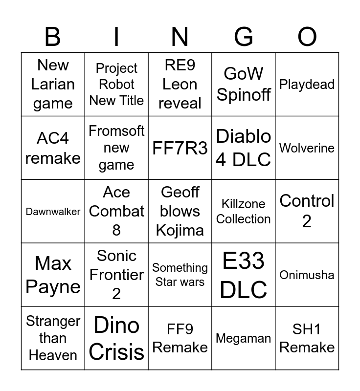This bingo card has a free space and 24 words: Sonic Frontier 2, Dino Crisis, FF7R3, Stranger than Heaven, Playdead, New Larian game, AC4 remake, Project Robot New Title, Killzone Collection, Something Star wars, Diablo 4 DLC, Dawnwalker, E33 DLC, Onimusha, Fromsoft new game, Megaman, Control 2, RE9 Leon reveal, Wolverine, Ace Combat 8, SH1 Remake, Max Payne, GoW Spinoff and FF9 Remake.