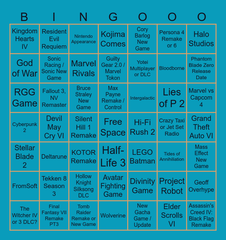 This bingo card has a free space and 48 words: Divinity Game, Bloodborne, Wolverine, Devil May Cry VI, Bruce Straley New Game, Grand Theft Auto VI, Resident Evil Requiem, Final Fantasy VII Remake PT3, Persona 4 Remake or 6, Half-Life 3, Halo Studios, Kojima Comes, Lies of P 2, Intergalactic, FromSoft, Crazy Taxi or Jet Set Radio, God of War, Phantom Blade Zero Release Date, Project Robot, Cory Barlog New Game, Yotei Multiplayer or DLC, Silent Hill 1 Remake, Kingdom Hearts IV, Sonic Racing / Sonic New Game, Geoff Overhype, Marvel Rivals, Marvel vs Capcom 4, The Witcher IV or 3 DLC?, Max Payne Remake / Control, Fallout 3, NV Remaster, Elder Scrolls VI, Hi-Fi Rush 2, Mass Effect New Game, Tekken 8 Season 3, Cyberpunk 2, LEGO Batman, Tides of Annihiliation, RGG Game, KOTOR Remake, Hollow Knight Silksong DLC, Stellar Blade 2, Assassin's Creed IV: Black Flag Remake, Nintendo Appearance, Tomb Raider Remake or New Game, Guilty Gear 2.0 / Marvel Tokon, Avatar Fighting Game, Deltarune and New Gacha Game / Update.