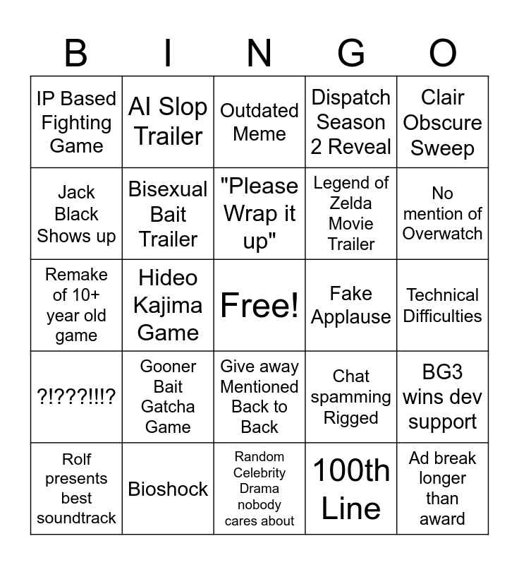 This bingo card has a free space and 24 words: Gooner Bait Gatcha Game, Bioshock, "Please Wrap it up", Rolf presents best soundtrack, Clair Obscure Sweep, IP Based Fighting Game, Jack Black Shows up, AI Slop Trailer, Fake Applause, Give away Mentioned Back to Back, Legend of Zelda Movie Trailer, Remake of 10+ year old game, Chat spamming Rigged, BG3 wins dev support, Bisexual Bait Trailer, 100th Line, Technical Difficulties, Outdated Meme, No mention of Overwatch, Hideo Kajima Game, Ad break longer than award, ?!???!!!?, Dispatch Season 2 Reveal and Random Celebrity Drama nobody cares about.